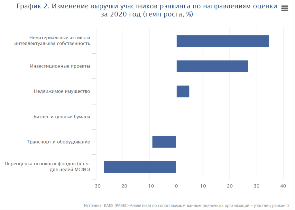 Высокую динамику роста вопреки пандемии сохранили такие направления оценочных услуг, как оценка нематериальных активов и интеллектуальной собственности (НМА и ИС) и оценка инвестиционных проектов. По итогам 2020 года доходы участников рэнкинга в этих сегментах оценки выросли на 35 и 27% соответственно, составив 317,5 млн рублей и 208,5 млн рублей.